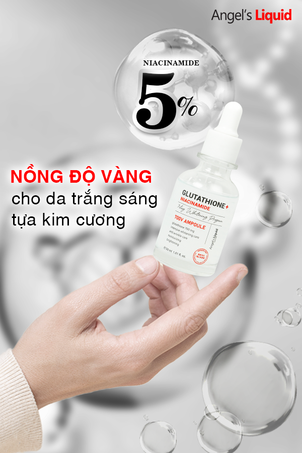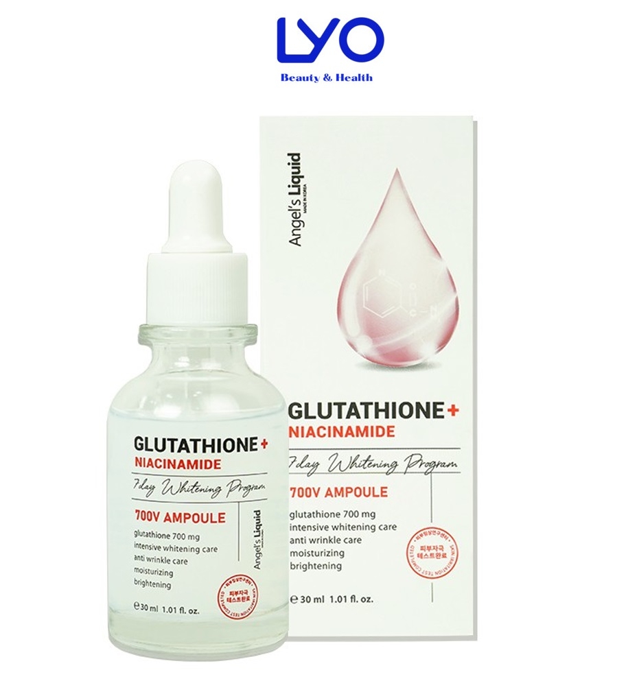 - Angel’s Liquid Glutathione + Niacinamide 700V-ampoule cải thiện chuyên sâu tình trạng da sạm màu, thâm nám, tàn nhang, se khít lỗ chân lông và làm mờ nếp nhăn li ti. Hơn hết, sản phảm này đã tạo tiếng vang lớn trong giới skincare vì bảng thành phần đạt điểm 10 về chất lượng.