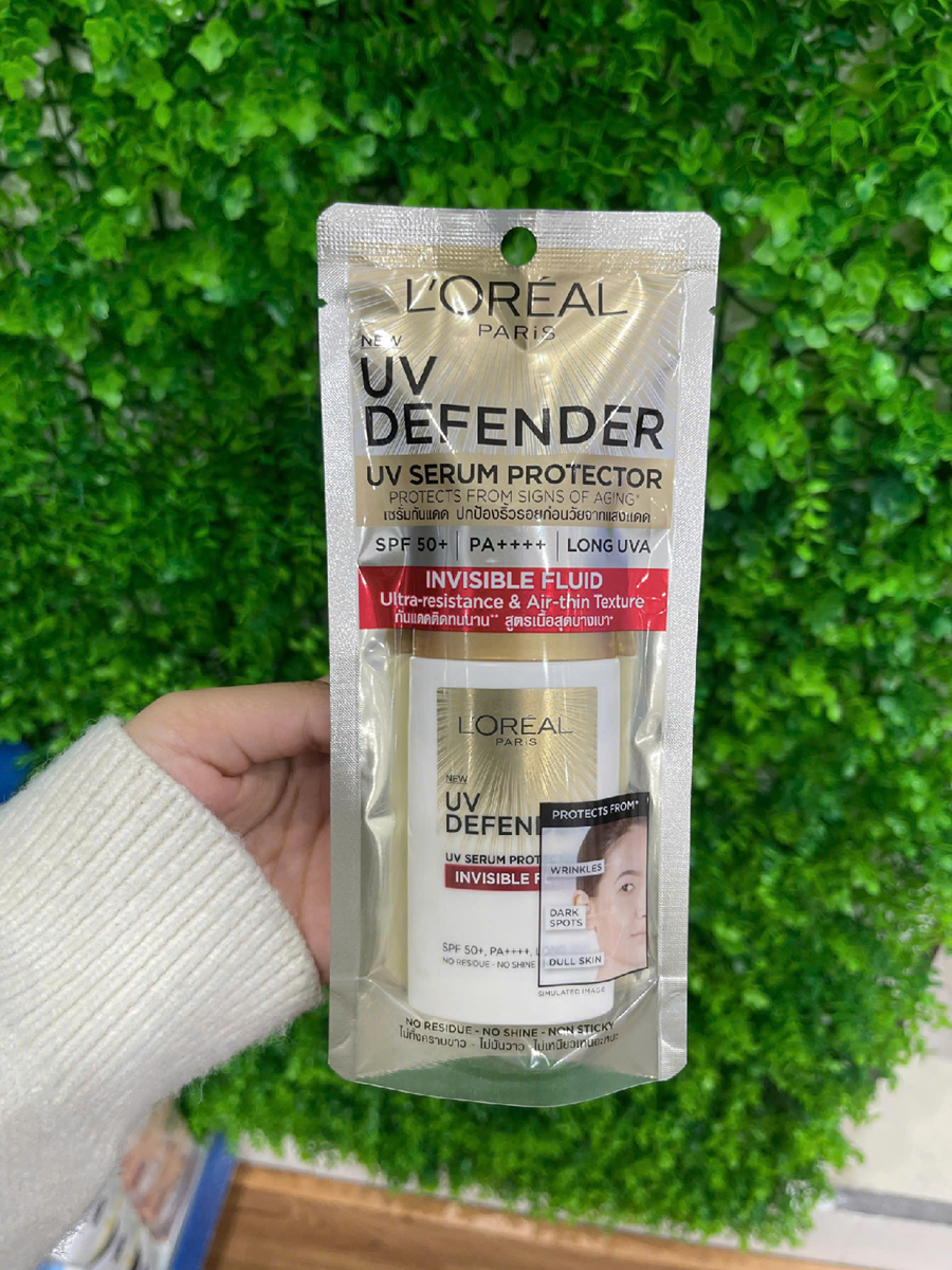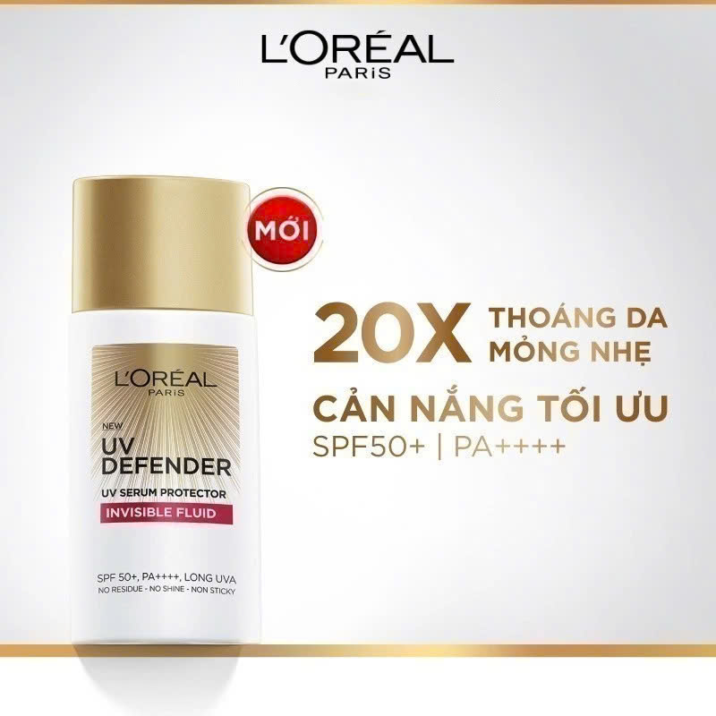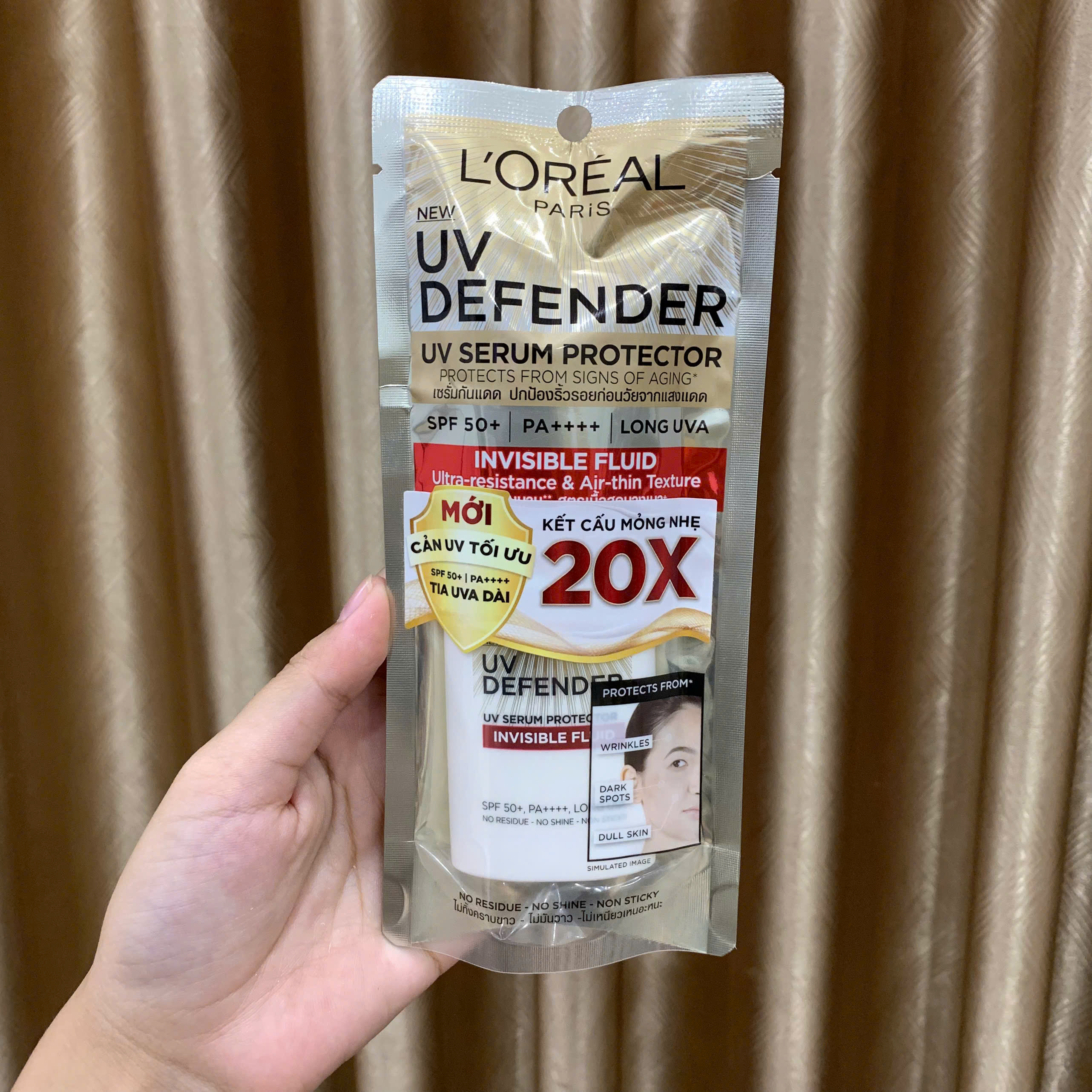 Kem Chống Nắng L’Oreal Paris UV Defender Serum Invisible Fluid SPF50+ PA++++ x20 Mỏng Nhẹ (Mới) sở hữu màng bảo vệ UV mạnh mẽ, giúp cản nắng tối đa nhưng vẫn nhẹ nhàng trên da. Với chỉ số chống nắng SPF50+ và khả năng chống lại tia UVA dài, sản phẩm giúp bảo vệ da hiệu quả khỏi các dấu hiệu lão hoá do tia UV gây ra như: đốm nâu, da xỉn màu và nếp nhăn.