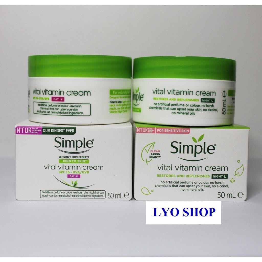 - Simple Kind to Skin Vital Vitamin Day Cream SPF 15 là sản phẩm kem dưỡng ẩm được tích hợp các thành nh phần thân thiện với da. Kem dưỡng ẩm bổ sung các hàm lượng vitamin E và Pro-vitamin B5 có tác dụng tăng khả năng ngậm nước của da mặt, đồng thời hỗ trợ các quá trình tái tạo của da.