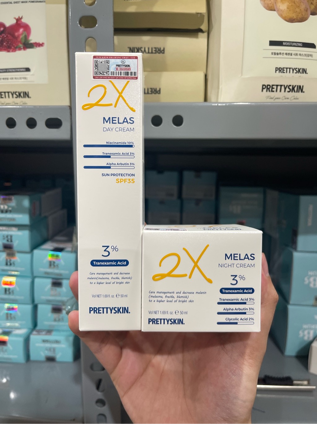 – Pretty Skin Melas 2X Day Cream dùng ban ngày vào buổi sáng, Pretty Skin Melas 2X Night Cream dùng buổi tối.