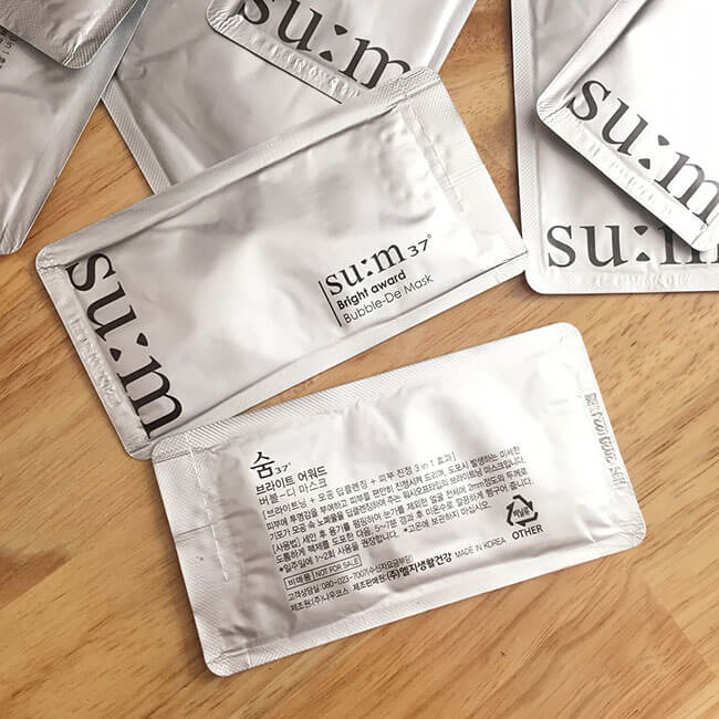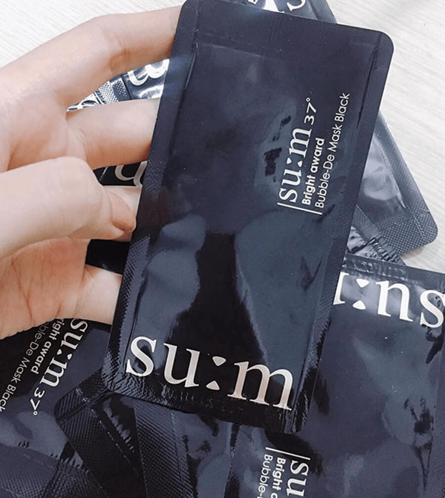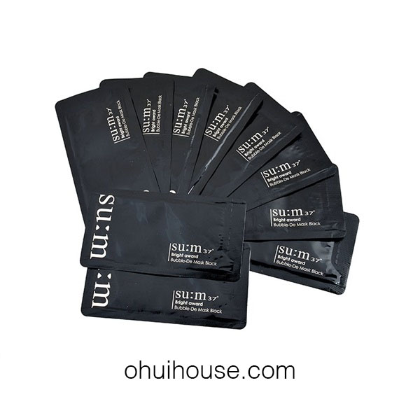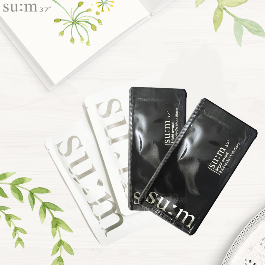 1. SU:M37 Bright Award Bubble-De Mask Black (màu đen) : Thải độc qua lớp bong bóng, làm sạch tận sâu bên trong lỗ chân lông.Ở sản phẩm này có thêm thành phần bổ sung than hoạt tính hỗ trợ loại bỏ các tế bào chết, bã nhờn, mụn đầu đen, mụn cám ở vùng mũi rất hiệu quả.