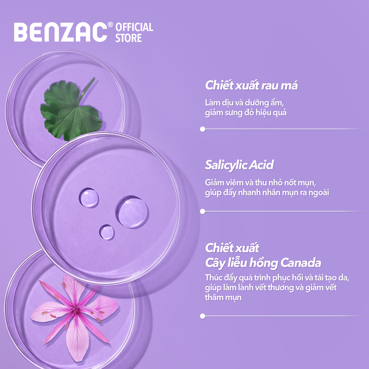 - Chiết xuất rau má: làm dịu, dưỡng ẩm, làm dịu vết sưng đỏ vết mụn
