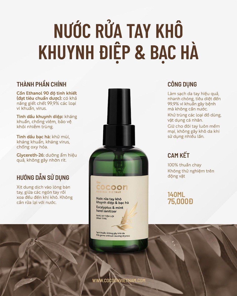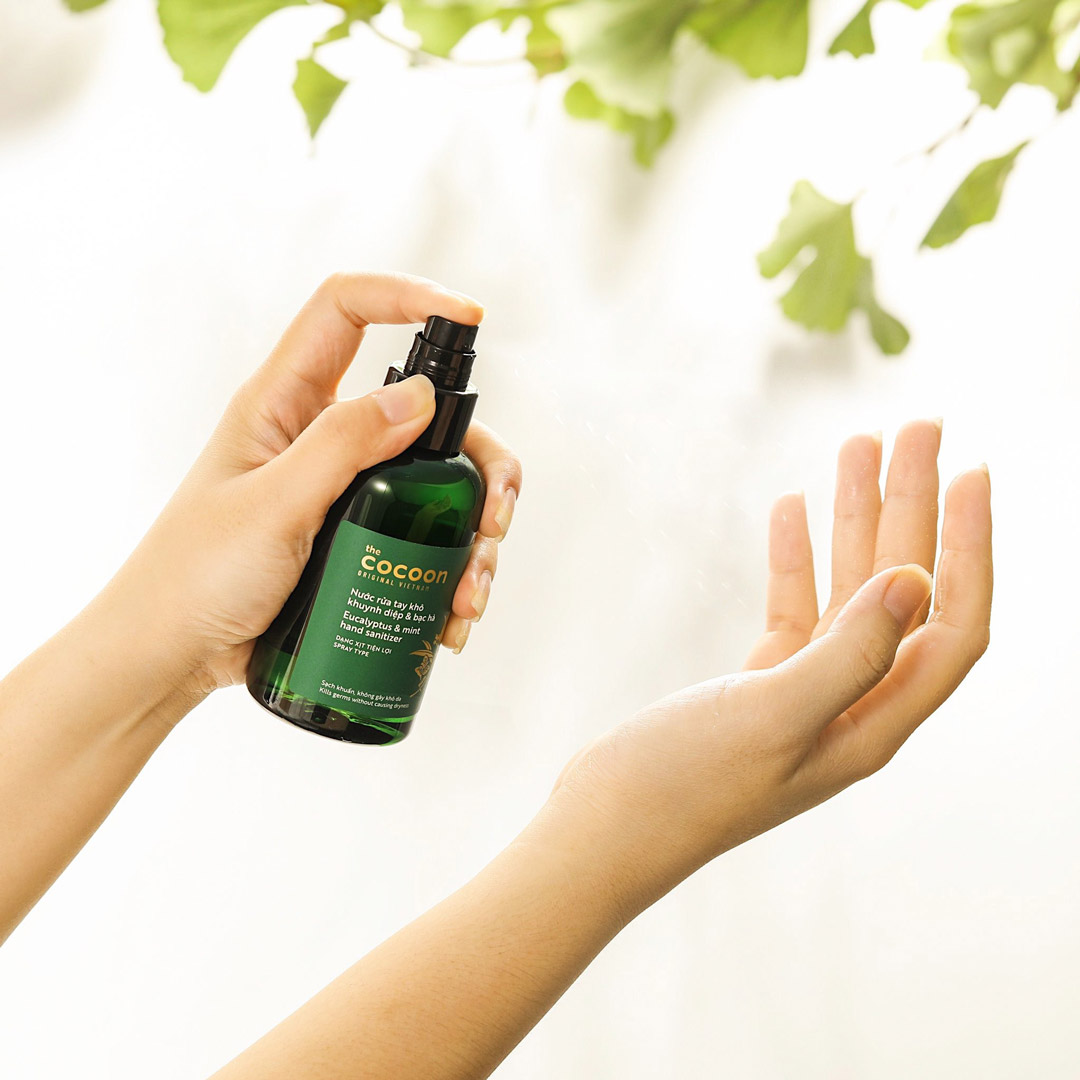 xin giới thiệu đến các bạn Nước Rửa Tay Khô Khuynh Diệp & Bạc Hà Cocoon Eucalyptus & Mint Hand Sanitizer với thiết kế dạng chai xịt phun sương tiện dụng cùng công thức chứa cồn Ethanol 90 độ tinh khiết, kết hợp cùng các loại tinh dầu thiên nhiên và thành phần dưỡng ẩm Glycereth-26, sẽ là sự lựa chọn lý tưởng để bảo vệ cho chính bản thân bạn cũng như gia đình trong bối cảnh dịch bệnh nhiều phức tạp.