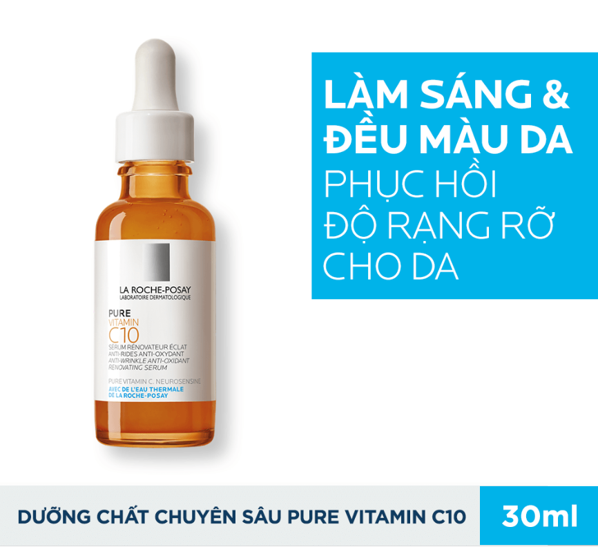 - Serum La Roche-Posay C10 tác động lập tức nhằm đem lại làn da mềm mịn, ngậm nước và trắng sáng. Các nếp nhăn được giảm thiểu, kết cấu da được tinh chỉnh với sắc tố đồng đều nhờ các thành phần chủ đạo: