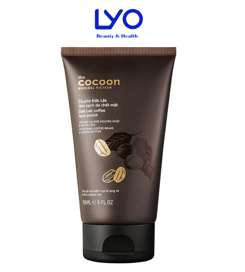 - Kem Tẩy Da Chết Chiết Xuất Cà Phê Đắk Lắk Cocoon Dak Lak Coffee Face Polish hiện đã có mặt tại LYO SHOP với chiết xuất hạt cà phê Đắk Lắk xay nhuyễn, nhẹ nhàng lấy đi sạch lớp da chết cùng bã nhờn, trong cà phê chứa nhiều caffeine có khả năng làm tăng độ săn chắc và đàn hồi cho da, mang đến làn da mềm mại, đều màu, ngăn chặn quá trình lão hóa.