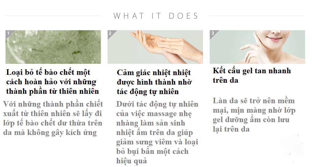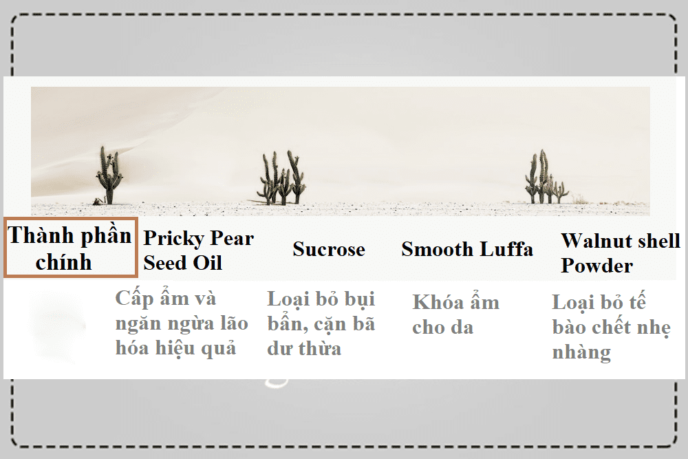 - Ngoài ra còn được chiết xuất từ đường nâu và hạt óc chó xay mịn: gột bỏ tế bào chết một cách nhẹ nhàng nhất và làm thu nhỏ lỗ chân lông.
