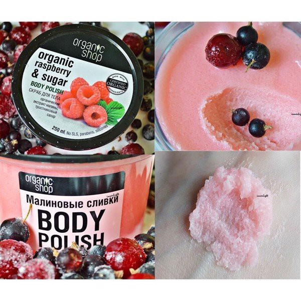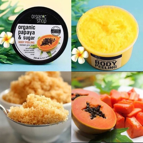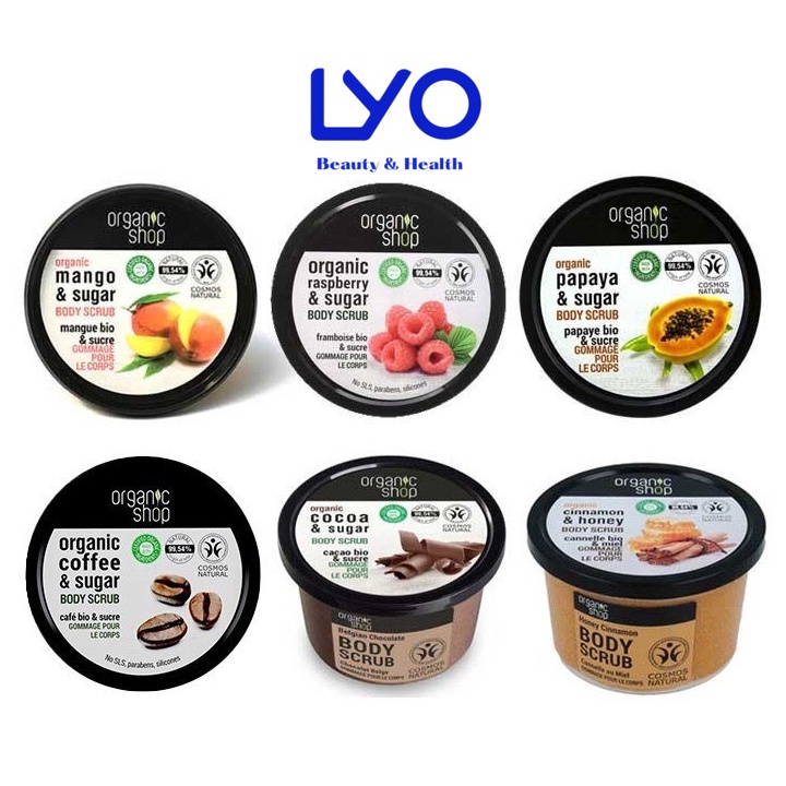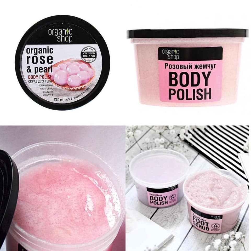 + Dòng sản phẩm Organic Shop có rất nhiều sản phẩm tẩy da chết toàn thân. Dưới đây là một số loại được ưa chuộng tại Nga và các nước Châu Âu, Á