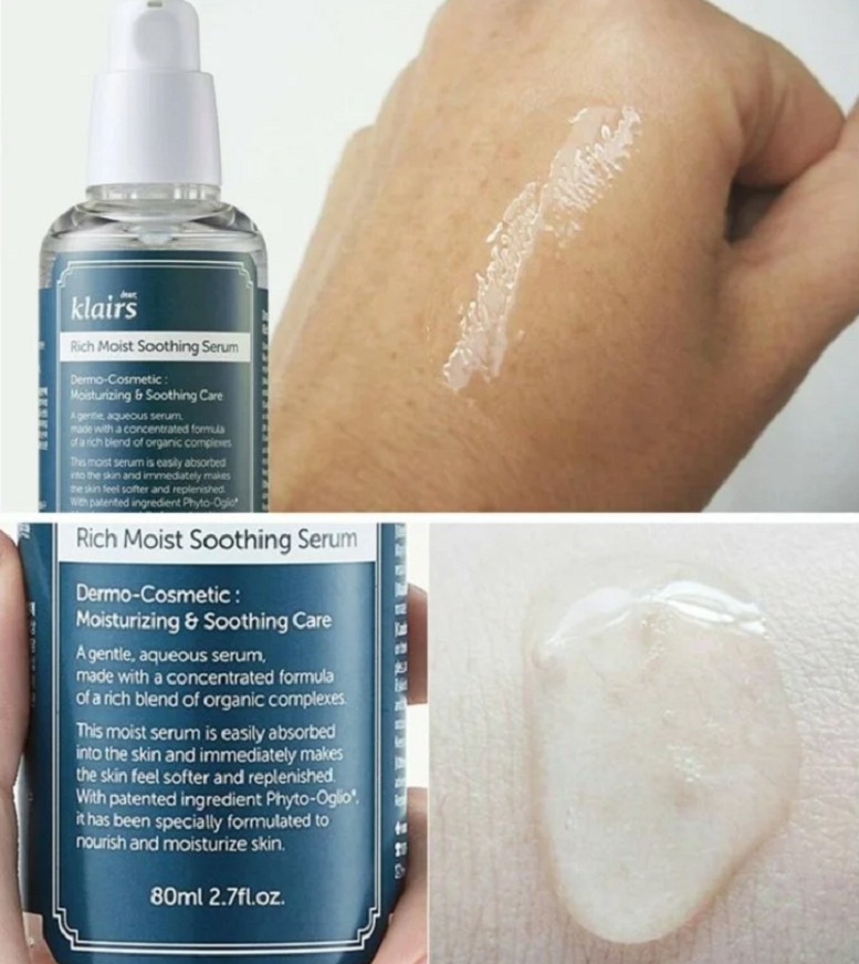 Tinh Chất Dưỡng Ẩm Sâu Klairs Rich Moist Soothing Serum với dạng gel trắng cô đặc, trong suốt thẩm thấu nhanh vào da, giúp dưỡng da nhẹ nhàng, hỗ trợ cấp nước và độ ẩm, da bạn trông sẽ căng mịn và dịu mát gần như tức thì.
