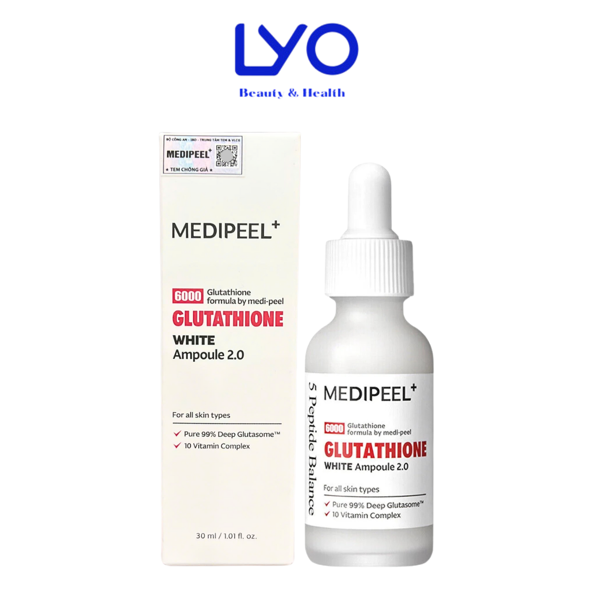 Tinh chất trắng da Medi Peel Glutathione 600 White Ampoule Serum với thành phần Glutathione chống oxy hoá mạnh, giúp lấy đi các gốc tự do, độc tố, kim loại nặng tiềm ẩn sâu bên trong da, giúp tập trung làm trắng da vượt trội, ức chế Melanin và cải thiện tàn nhang, mờ thâm nám, dưỡng ẩm, làm mềm da mang đến một làn da mịn màng trắng hồng bên trong và tràn đầy sức sống.