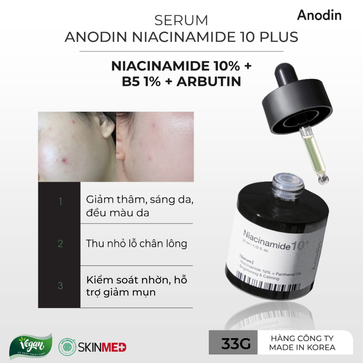 Tinh Chất Serum Dưỡng Trắng Da, Mờ Thâm Nám Anodin Niacinamide 10 Plus Hàn Quốc 33ml